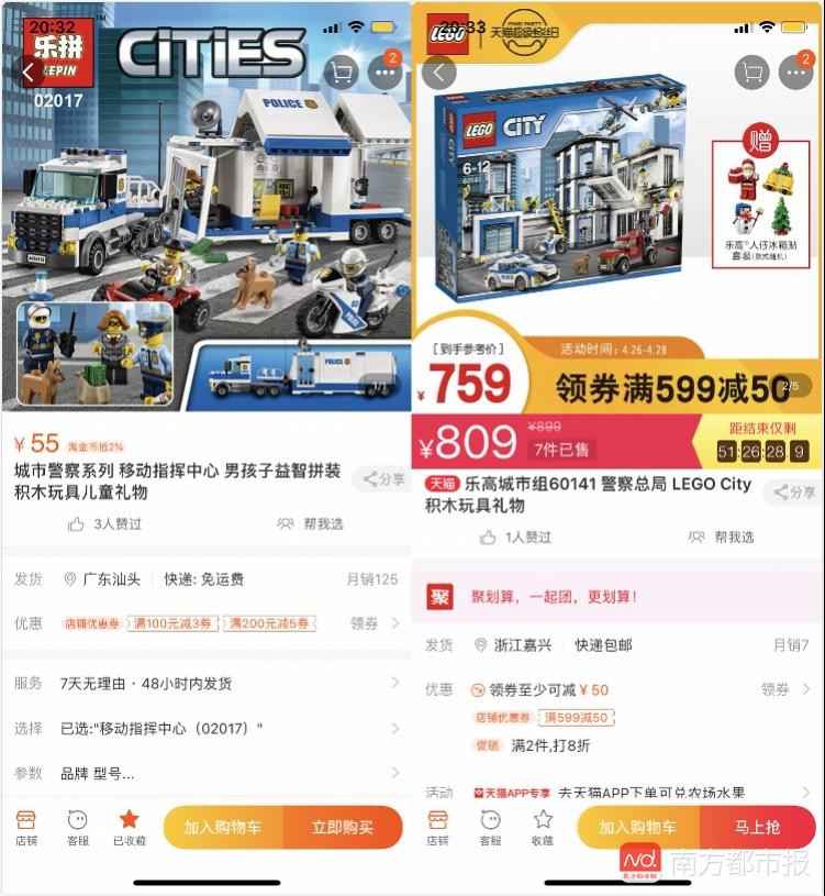 据悉,这也是上海警方首例侦破全国首例侵犯知名品牌玩具案。除被查获的这批仿制“乐高”品牌拼装玩具外,南都记者此前发现,市面上仍大量存在各种品牌的仿制“乐高”拼装积木,某电商平台上有多家店铺出售品牌名称为“乐拼”的拼装积木,其商品介绍页面展示的多个玩具模型细节都与原版乐高拼装玩具完全一致,价格却与正品乐高积木相差14倍。
